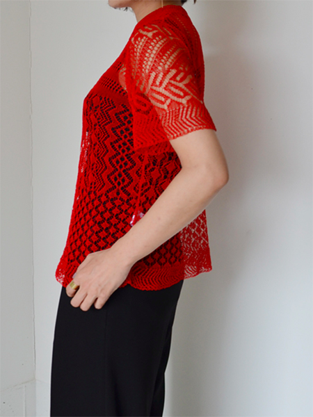 細かい編み目が涼しげで夏には、キャミソールの上にさらっと1枚で着たくなります。