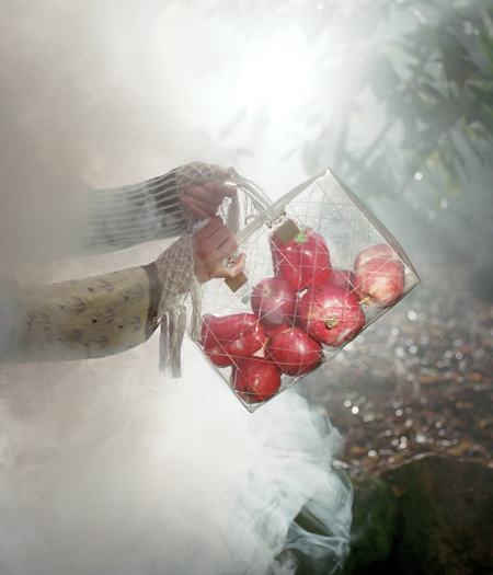 ホールガーメントの技術を用いて、透け感のあるベースにリリーヤーン、モールヤーン、和紙糸、ポリエステルなど、様々な編み地を貼り付けたようなデザインです。