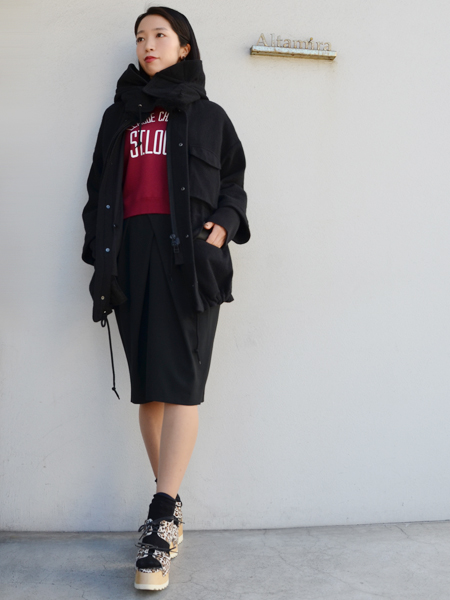 ウール素材とチノ素材を組み合わせたパンツはとてもMUVEILらしくて存在感大。