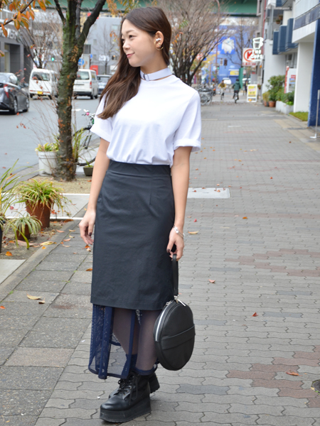 膝上のタイトスカートの裾からドレープしたメッシュが見える雰囲気がブラックでも重すぎず抜け感が出て春先にもぴったりなデザイン。