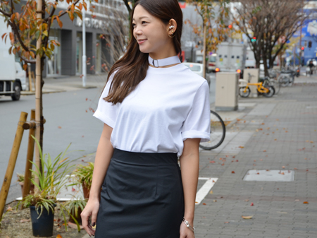 トップスはチョーカーがT-シャツと一体化した【CHRIE】らしいガーリーな1枚。