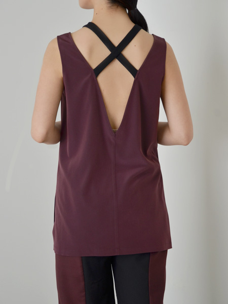 フロントは首つまりのデザインに対して、バックは大胆に開いたクロスデザインで後ろ姿まで印象的。