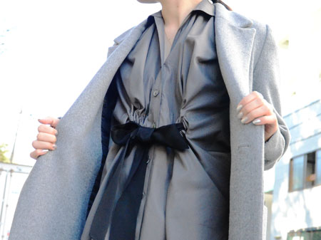 しっかりとリボンを結ぶほど、ウエストにギャザーが集まりコクーンシルエットが生まれます。