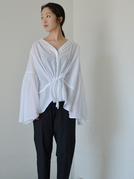 ホワイトのブラウスはふわりとした生地ですとどうしてもフェミニンな印象がありますが、こちらは上手く肌を出すことでヘルシーでエスニック風なアイテムに仕上げています。