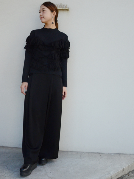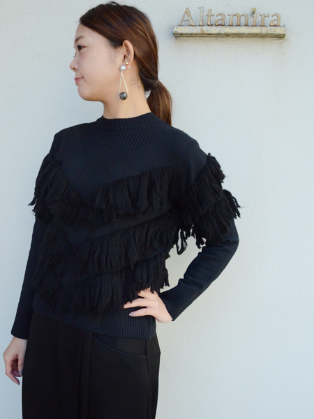 フリンジのボリューム感にコンパクトなニットのバランスが絶妙です。
