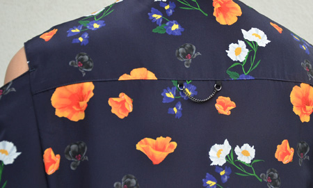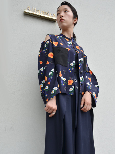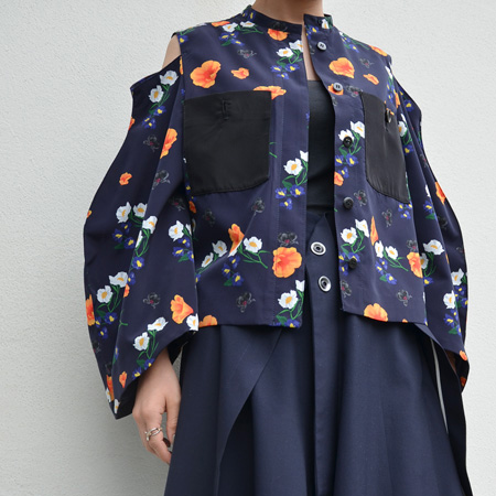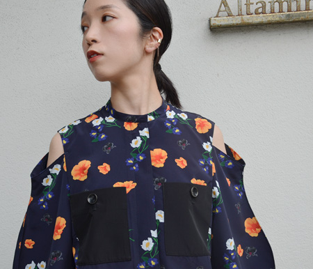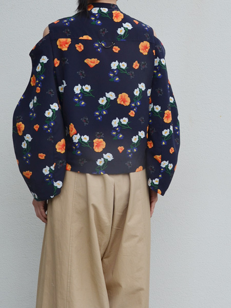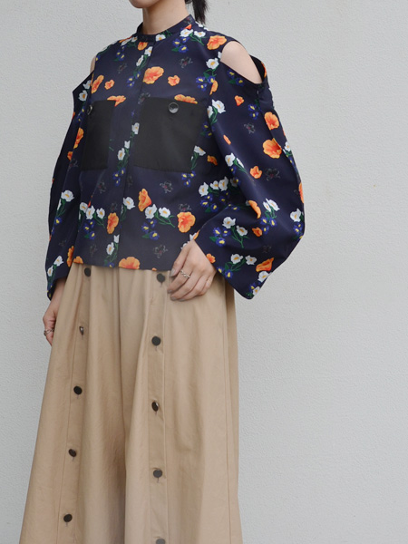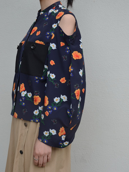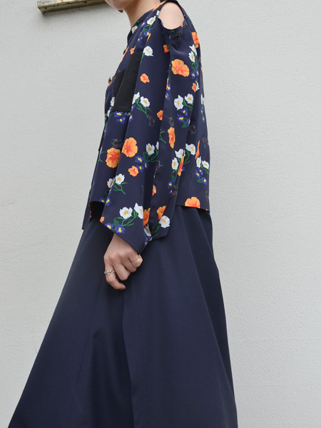 ネイビーをベースに白やオレンジのお花が浮かび上がってくるようなプリントが素敵なブラウス。