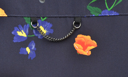 生地に近付いて見て頂くと、白やオレンジの向こうにグレーのお花やブルーのお花がひっそりと咲いている。