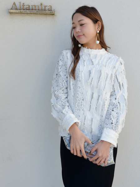 一見フェミニンなトップスなのに、ハイネックのデザインでマニッシュな要素もあるデザインがモードなお洋服にもぴったりでこれから入荷するアイテムとも間違いなく相性が良いですね。