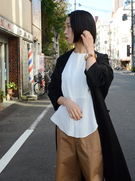 落ち感のあるしっとりとした生地感で、実際にコートを羽織って歩いている様がとても優雅です。