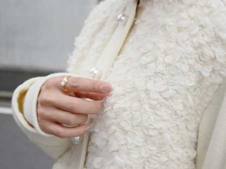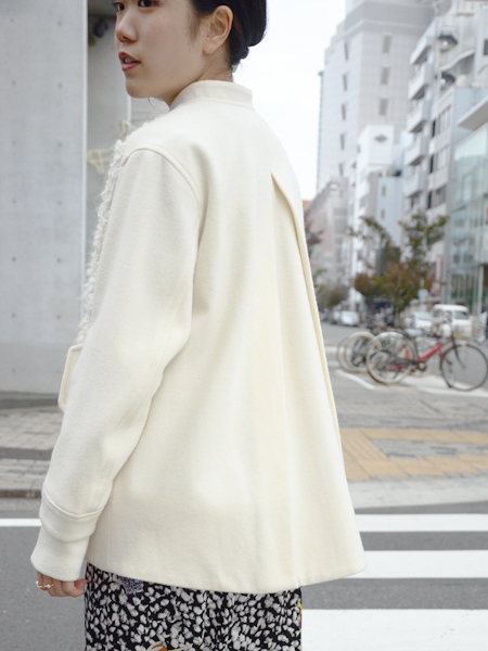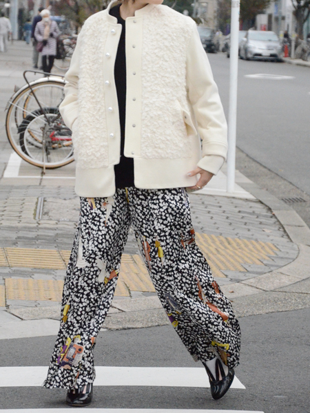 一見、ぬいぐるみのようなもこもこのループツイードやパールボタンに、可愛らしい印象を受けますが、シルエットはメンズライクなスタジャン風。