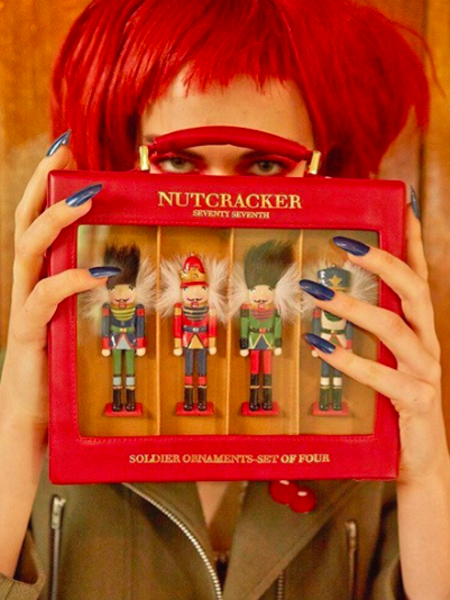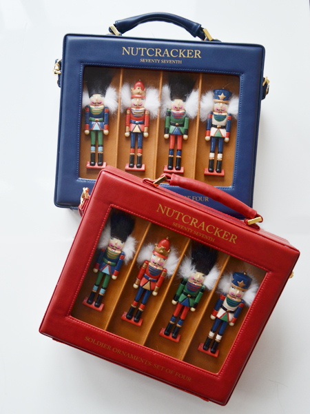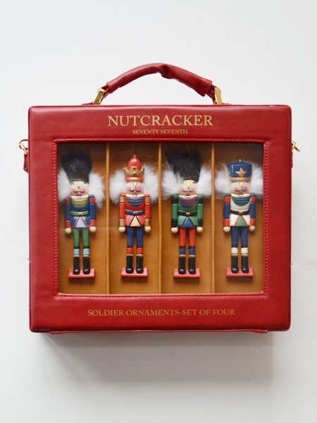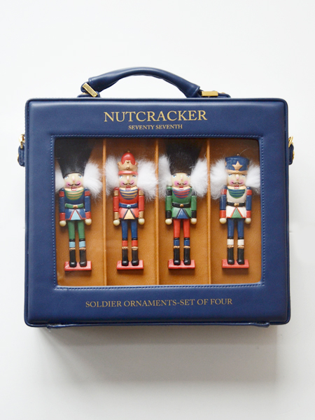 くるみ割り人形のオーナメントセットをイメージして作られたこのバッグ、人形たちもプリントや刺繍ではなくて、木彫りの、立体的な、リアルな作りになっているのが77thらしいところ。