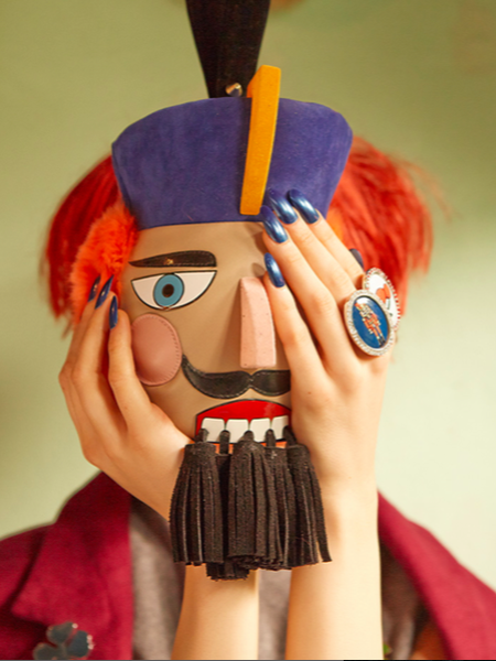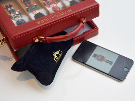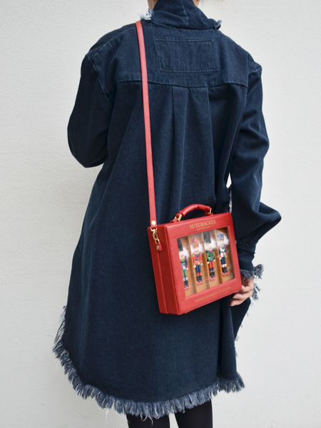 おもちゃのバッグようなデザインのはずなのに、柔らかなレザーの質感と発色良い赤、ゴールドの”NUTCRACKER”の文字に高級感と大人ならではの遊び心を感じました。