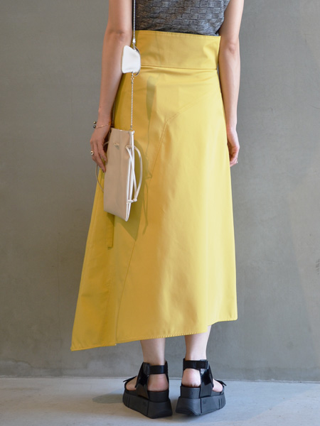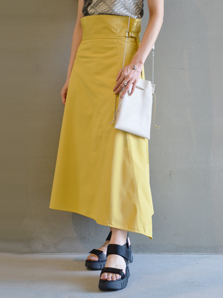 アシンメトリーの裾は印象的に揺れ、フレアスカートで下半身の張りをカバー。