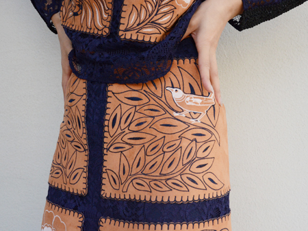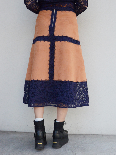 総レースのボディにスエード素材がドッキングされた非常に華やかなブラウスです。