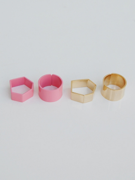 幅広の丸い形と、六角形の形をしたリング2セットのリング。