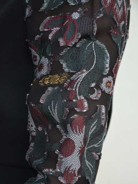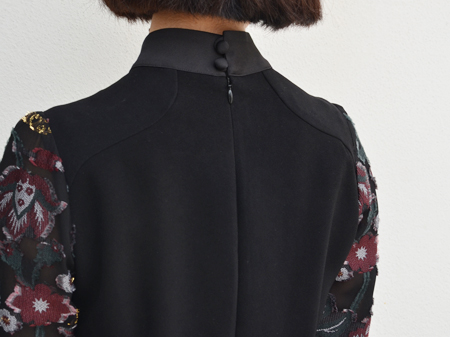 シフォンの生地に花柄の生地を貼り付けたように見えますが、ちゃんと手に取っていただくと全部織って柄を立体的に見せていて、袖の裏側を見ても本当に美しい。