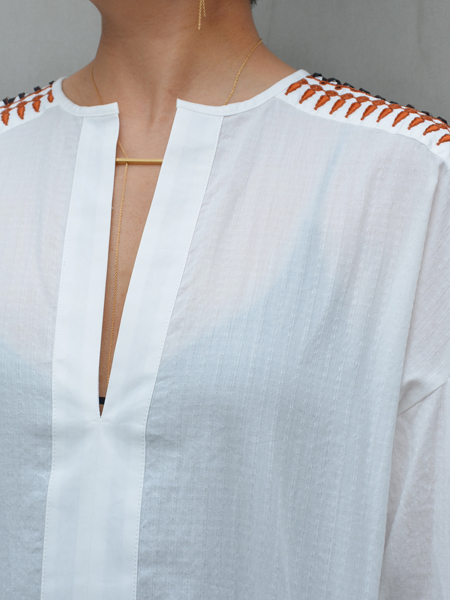 肩から袖口にはテープ刺繍で民族調の繊細な柄を表現。