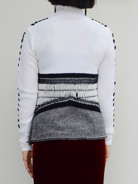 裾のペプラム部分もモノトーンで統一され、こぎん刺しの伝統的な和の要素を取り入れた装飾となっています。