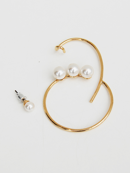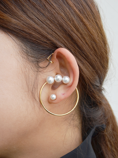 左耳用のイヤーカフで、パールのついたサークルの右端から伸びたゴールドが耳の形をしています。