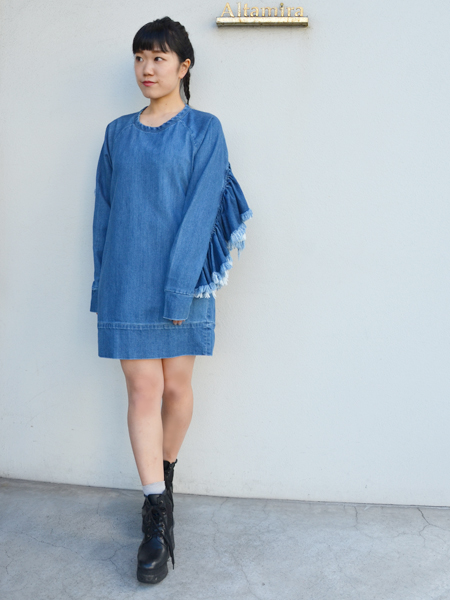 フロントはすっきりシンプル、バックスタイルはPONYSTONEらしい斬新なデザインの長袖デニムワンピースです。