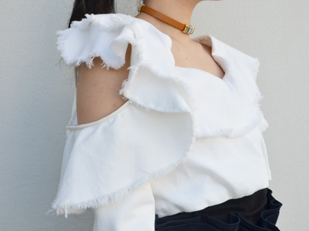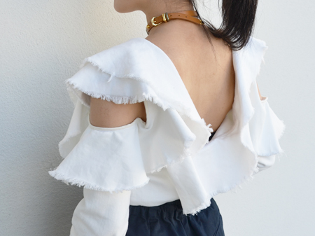 背中から袖にかけて寄せられたフリルにインパクトがありますよね。
