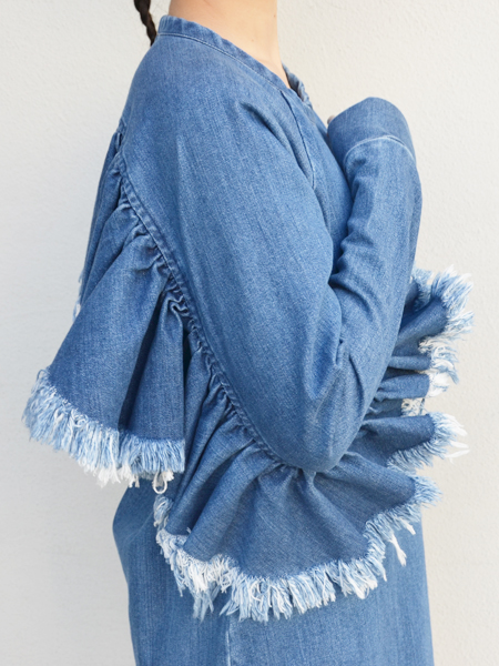 弧の字にカッティングされたデニムはギャザーも寄せられてフリルのようになっているのが可愛い♡