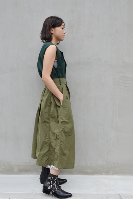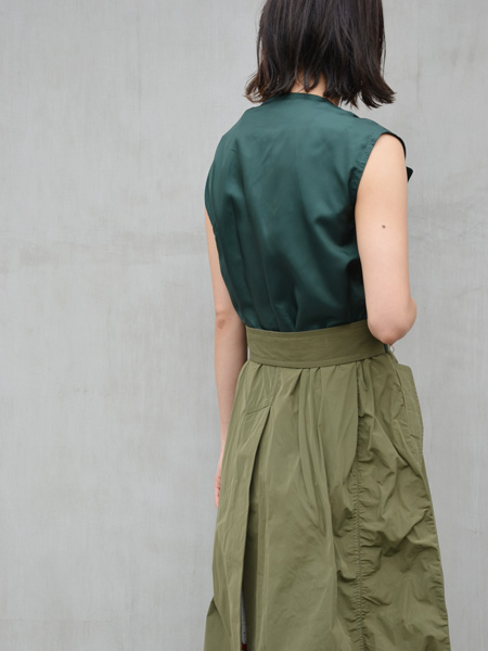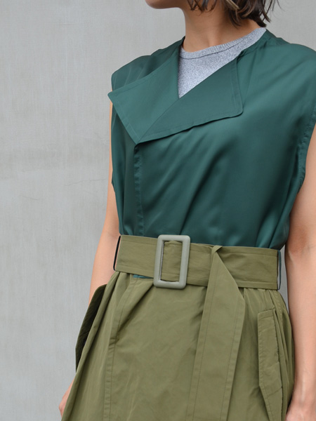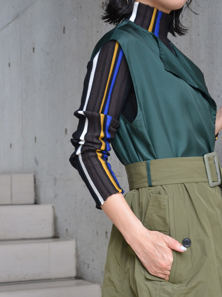 ノースリーブなので、インナー次第で袖を足したりと、レイヤードのコーディネイトに幅広く着やすいデザインとなっています。
