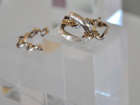 ゴツめのシルバーチェーンを解体し、その間を華奢なゴールドチェーンでくくりつけたようなデザイン。
