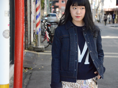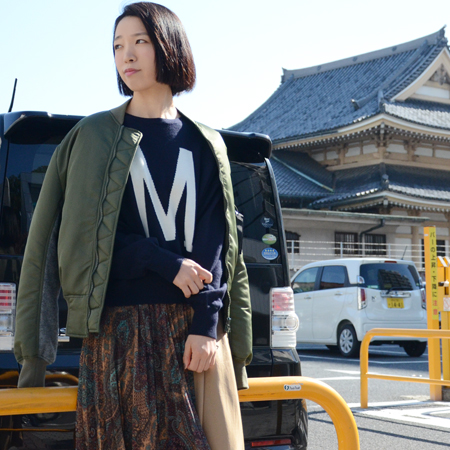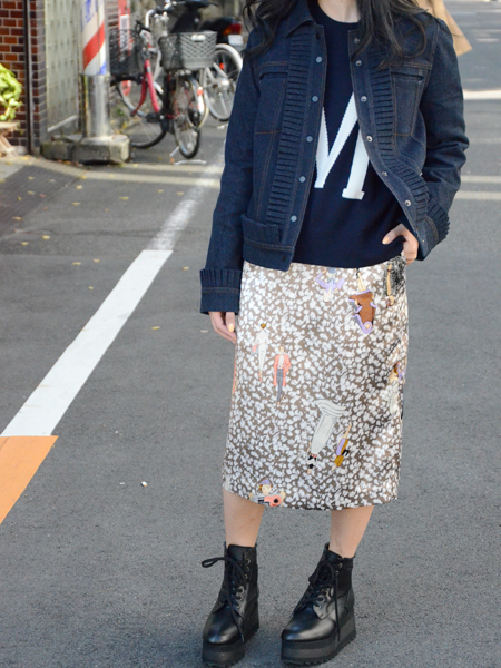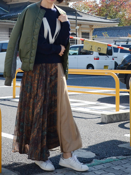 かんちえさんのシンプルアイテムとの合わせとは違い、柄物の膝丈スカートや、インパクトのあるアウターを合わせてコーディネイト。