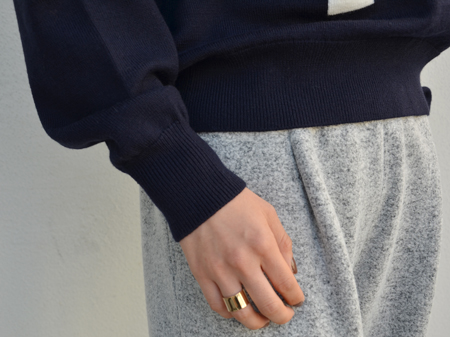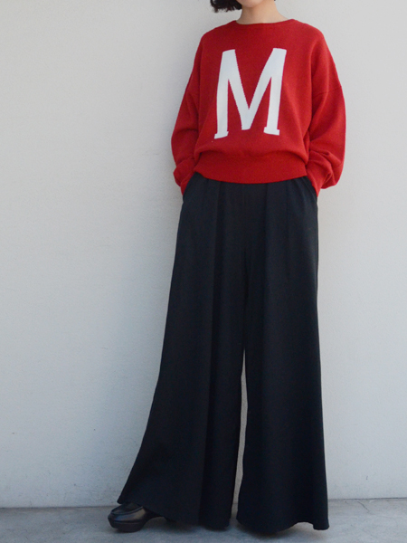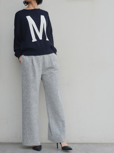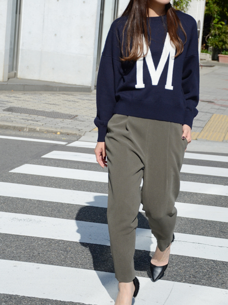 コンパクトサイズのニットなので、ボトムはワイドでも、スキニーでも。