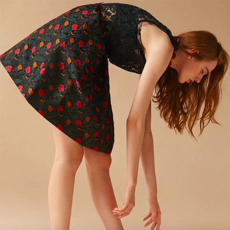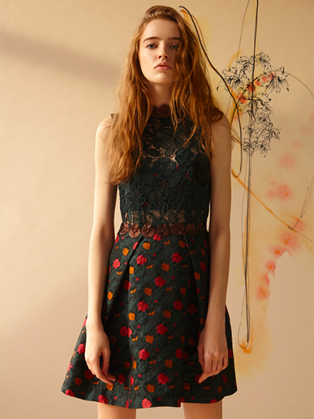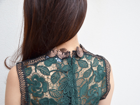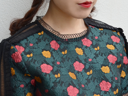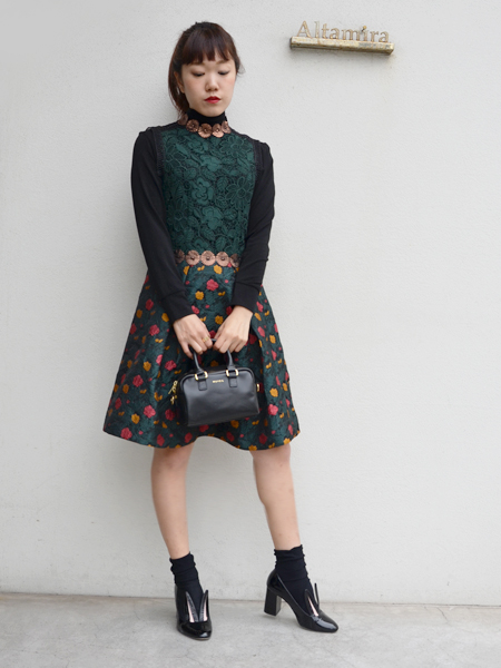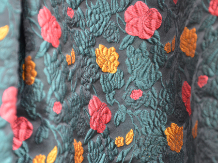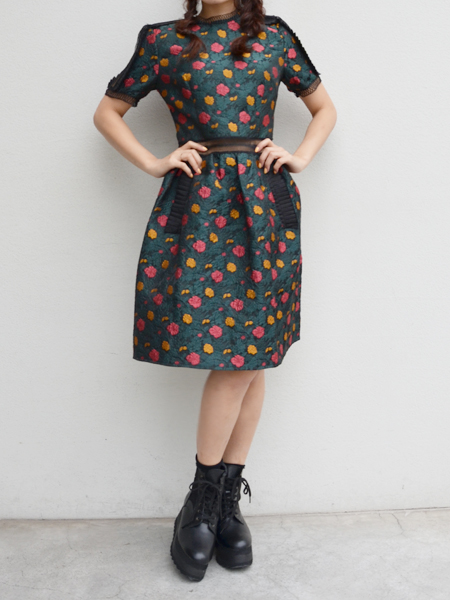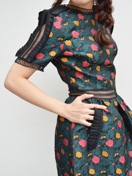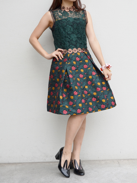 フォレストグリーンのフラワーレースと、色鮮やかなバラ柄のジャガードのコンビネーションドレス。