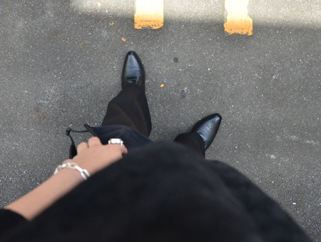全身ブラックのスタイリングにはシルバーパーツがアクセントに。