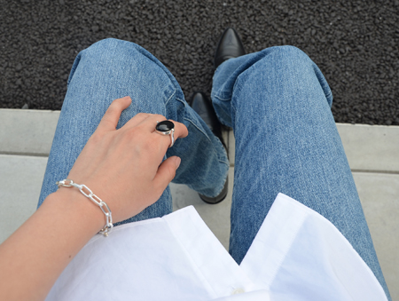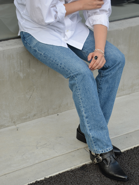 デニムパンツに白シャツという爽やかコーデに合わせる大人カジュアル。