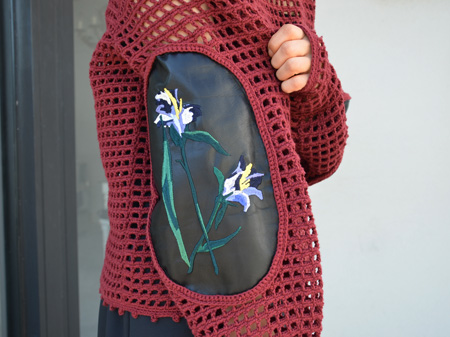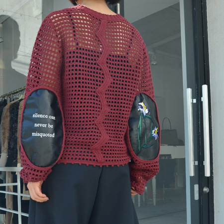 手編みで仕上げたクロシェ編みに、ひじ部分にレザー。