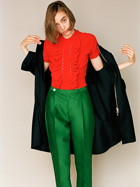 春にふさわしいはっとするほど鮮やかなニットトップス。