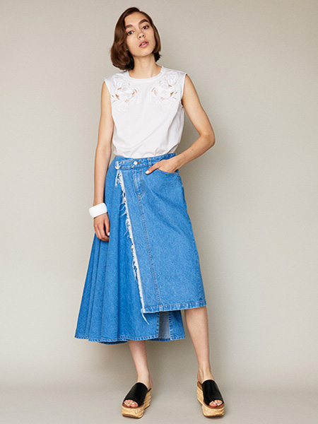 フレアの入ったロングスカートと、Gパンディテールのタイトスカートを組み合わせたデニムラップスカート。