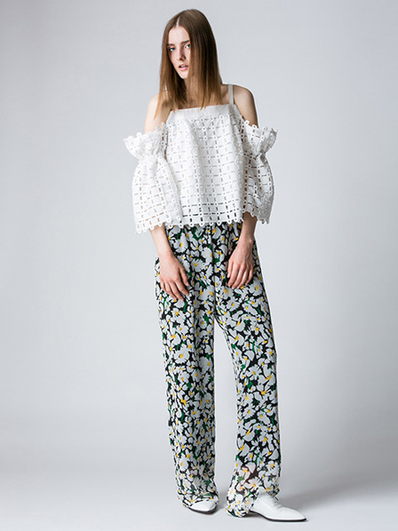 規則性のある素材とドレーピングの動き。フェンスの中に咲くフラワープリント。