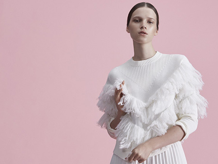 カットジャガードはリネンの風合いをそのまま柄に仕立てたものや、フリンジを全面に配したものを採用し、ハンドニットではクロシェを多用。