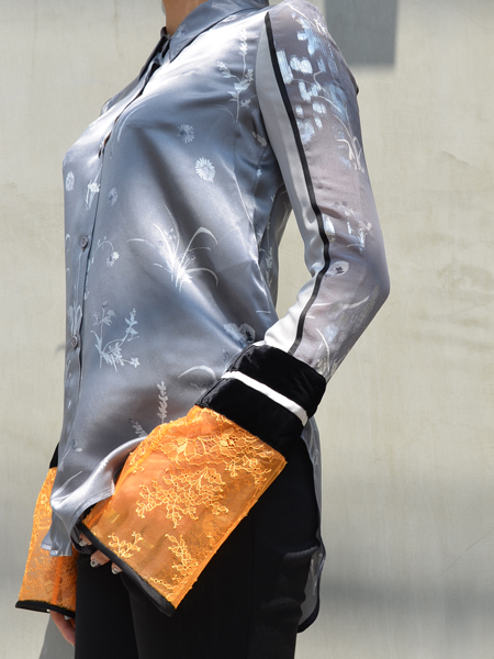 センシュアルに肌を透かす繊細なリバーレースと、ジャガード織りの上から素朴な花柄をプリントしたテキスタイルを重ね、着物の合わせのようなイメージをレイヤードスタイルで表現されています。