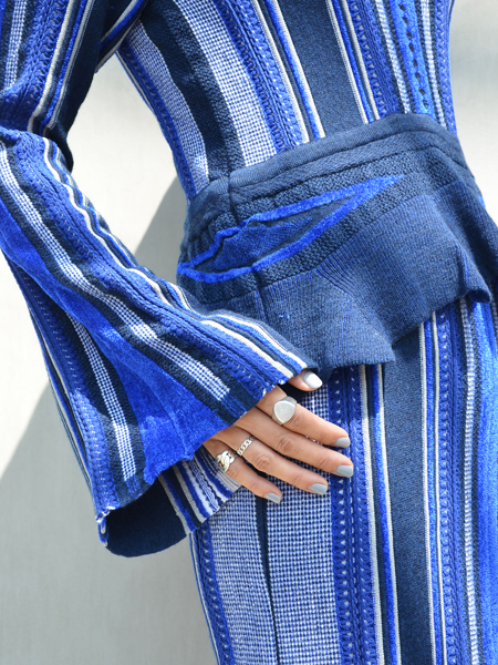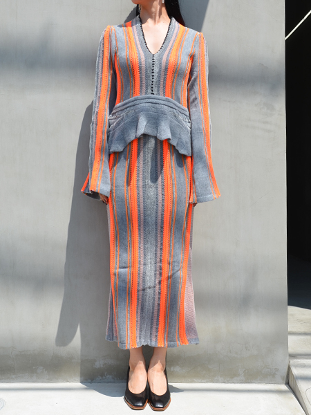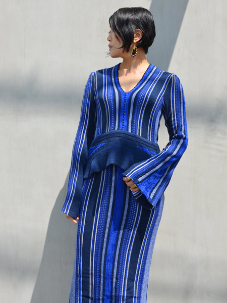 今シーズンのイメージカラー ”青” を美しく表現したストライプ柄ニットのドレス…