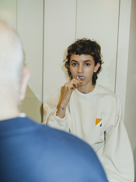 肩の力を抜いて、ちょっとフフッと笑いながら見られるようなLOOKです。
