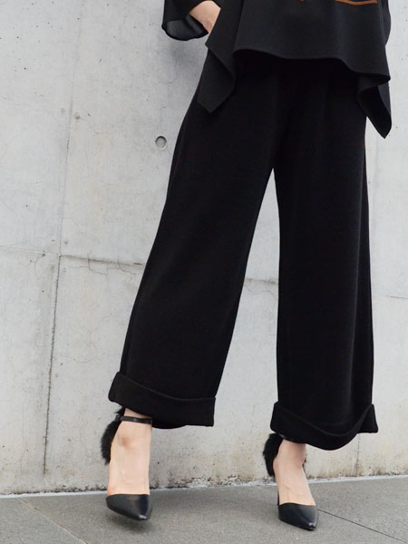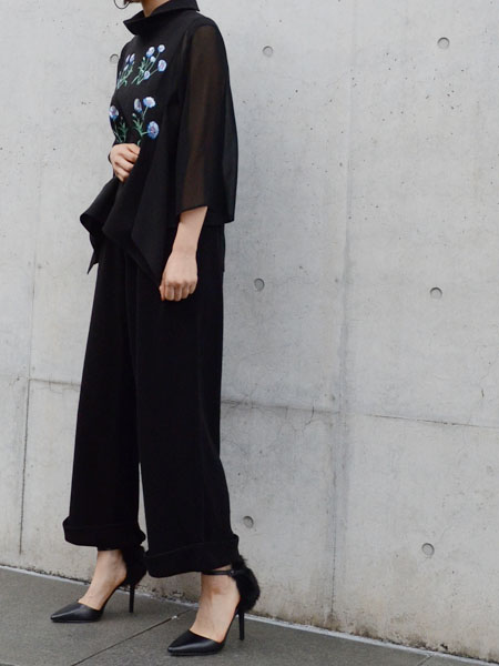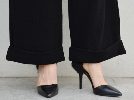 写真ではヒールと合わせているのでかかと部分までパンツを下げて着用していますが、普段はヒールの無いシューズと合わせていることが多いので、パンツを上げて足首を見せて着用しています。