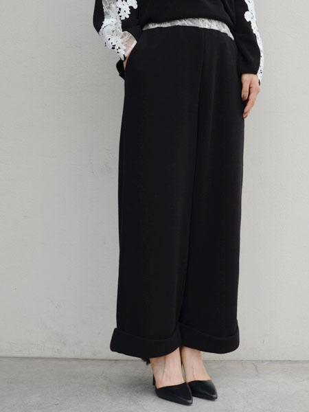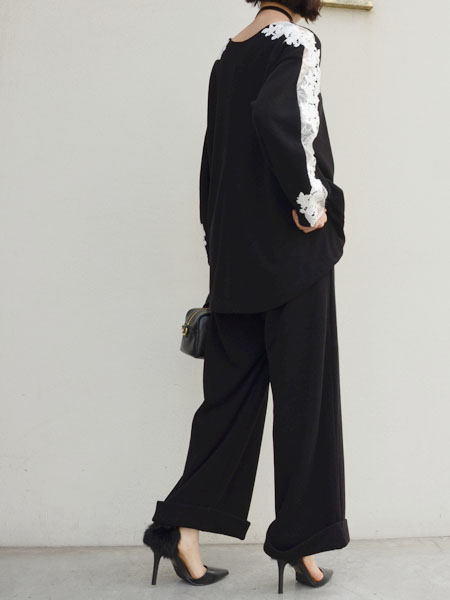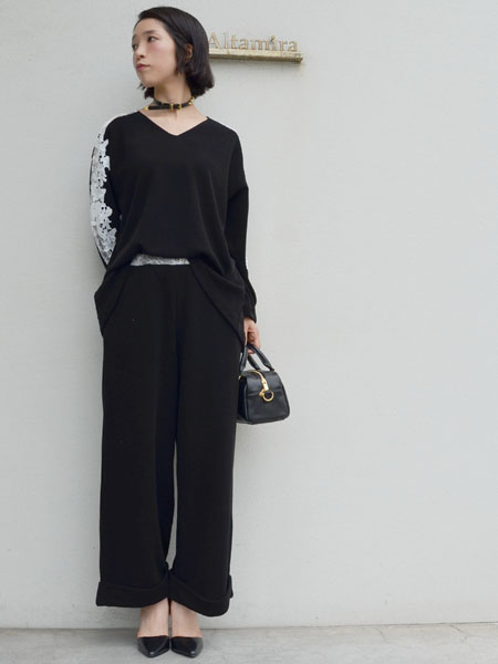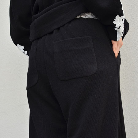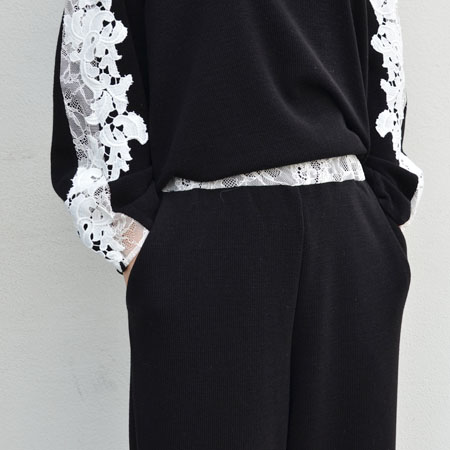 写真ではウエストのレースが見えるようにトップスをインしていますが、そのままトップスを下ろしてもらうとシンプルなニットのワイドパンツのようになります。