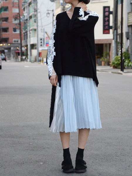 レースですが、ちょっとかっこいい雰囲気のデザインなのかな?と思われるニットですが、こうしてスカートと合わせてもらうと またイメージが変わります。