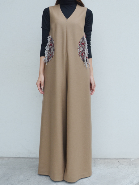 腰から幅広くなったパンツは前から見るとスカートのようでフェミニンな印象も。