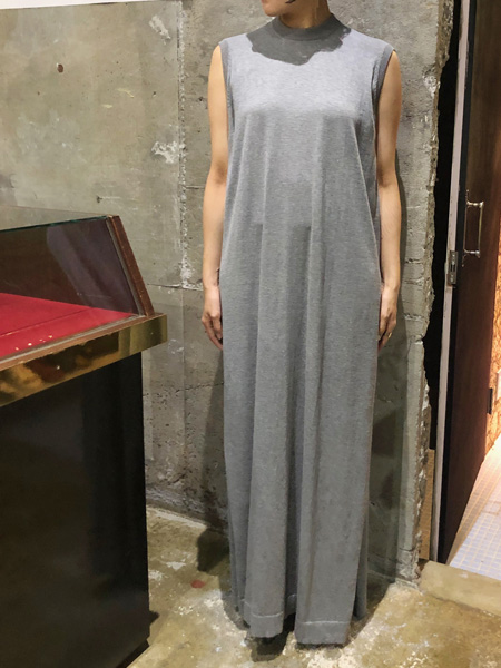 ポリエステル素材のハイゲージニットのロングドレス。