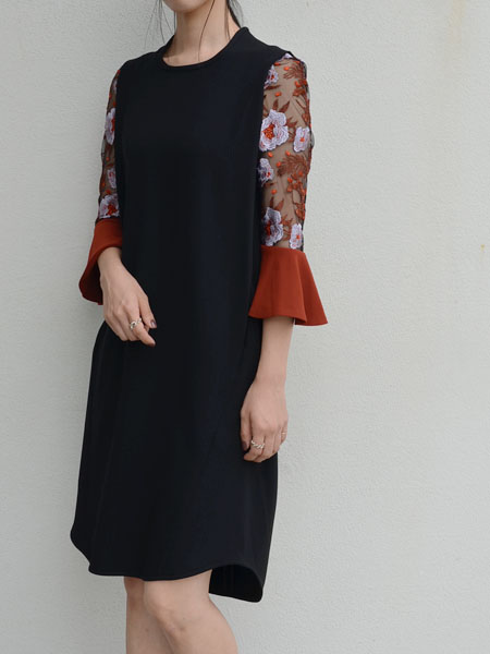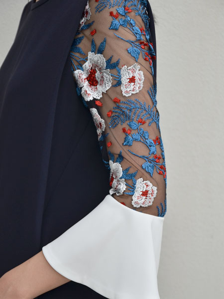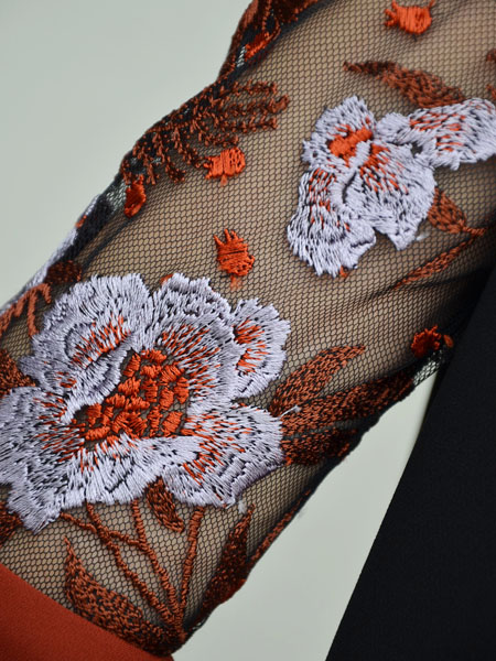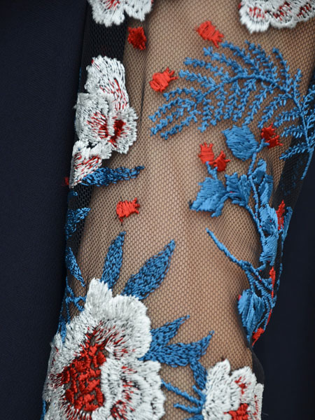 肌を透かす両袖は、シーズンを象徴するボタニカルなモチーフが刺繍され たチュールレースを使用。