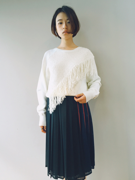 少しスポーティーな素材のMUVEILのプリーツスカートに合わせて、パンツとは違う、また新鮮な雰囲気で着こなしてくれました。