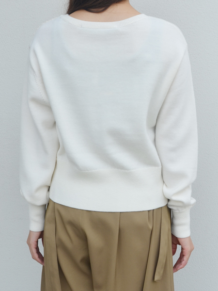 着丈はやや短めでコンパクトなのですが、ゆるりとしたドロップショルダーや、袖口のリブを太めに取り、袖にボリューム感を出したデザインも、カジュアルな中に女性らしさが光り素敵です。