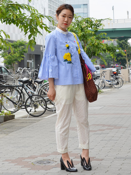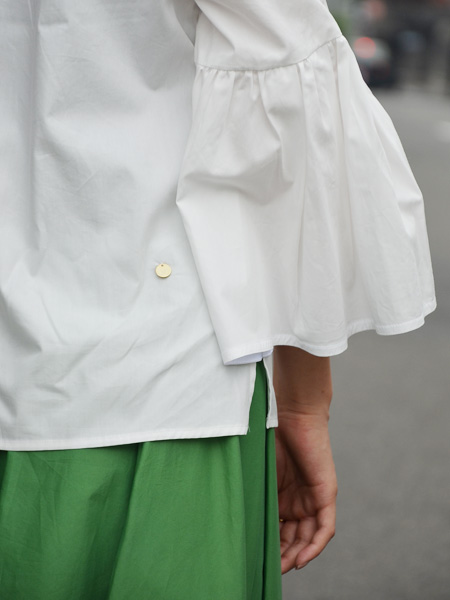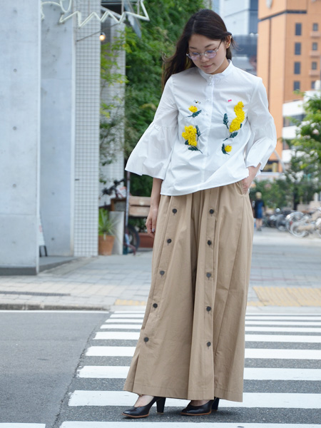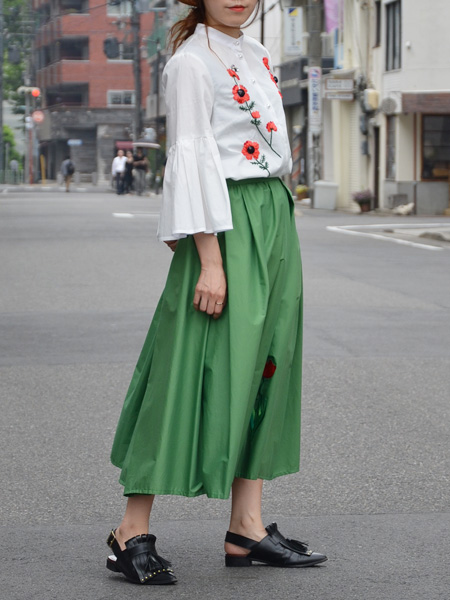ブラウスはタックインせず、ゆるっとチノワイドで合わせてリラックス感のあるスタイルをつくりました。かっちりとしたブラウスというアイテムの良さを壊さないよう、足元はきちんとヒールで。